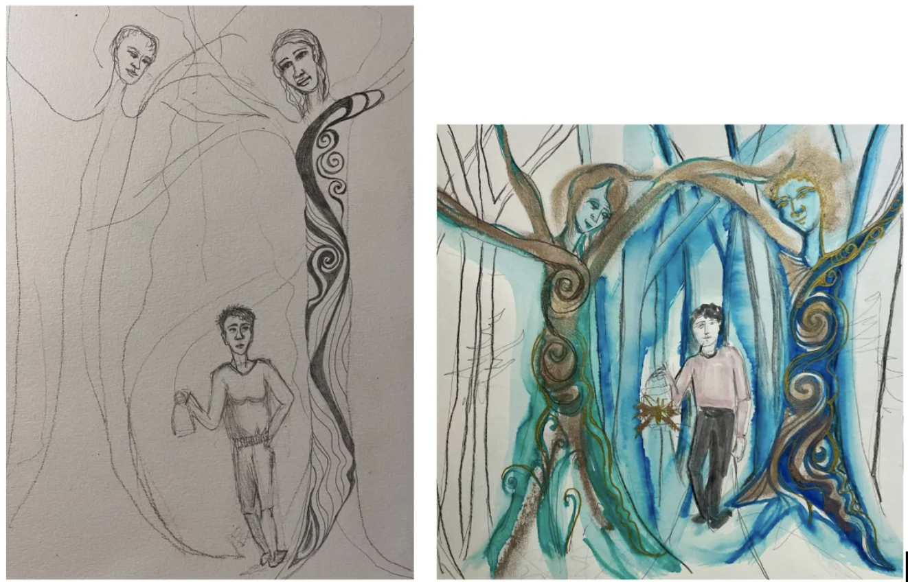 After hearing that the Sidhe emit a bluish light and are sometimes referred to as Blue People, I tried to capture this blue aura of light with a watercolor wash. In an earlier version (below), the blue aura just looked like the sky after I painted in the foreground. In the current version (above), I minimized the foreground and emphasized the line work with black and gold gel pens, bringing out the gold swirls and spirals in the trunk and limbs of the Forest Sidhe.